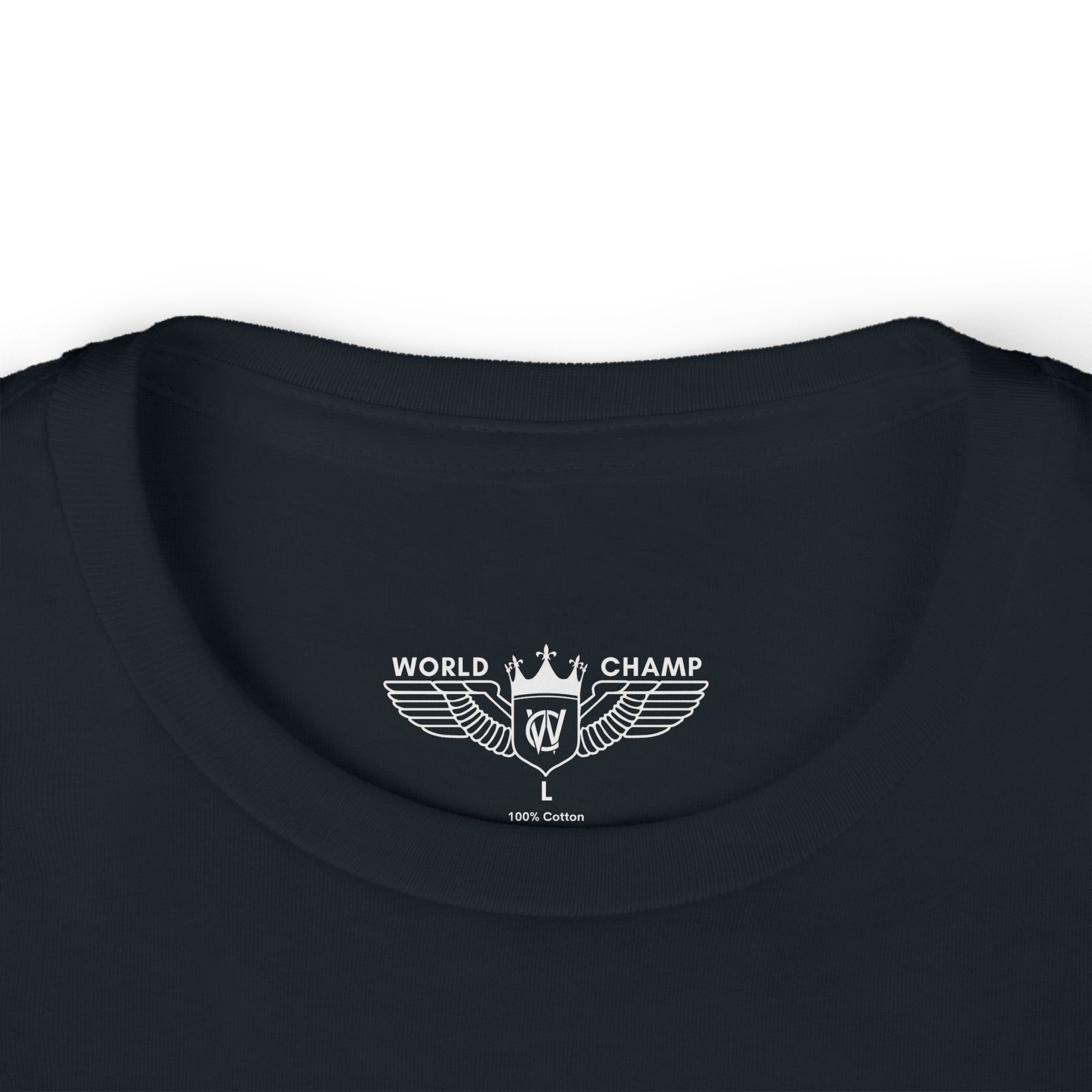 Lightweight and soft, this kids tee brings confident, playful energy to everyday wear. A compact sky‑blue emblem sits across the chest — wings, a crown, and a small shield — that reads “WORLD CHAMP.” It feels like the badge a child earns after a big win: small-scale, sweetly bold, and easy to layer under sweaters or over shirts. The cut is classic and slightly relaxed so kids can run, climb, and play without getting tangled in fabric. White background keeps the design clean and fresh, while the tear‑away label and sturdy ribbed collar keep kids comfortable all day. Let this shirt travel from backyard races to family outings, carrying that quiet, proud vibe wherever they go.
